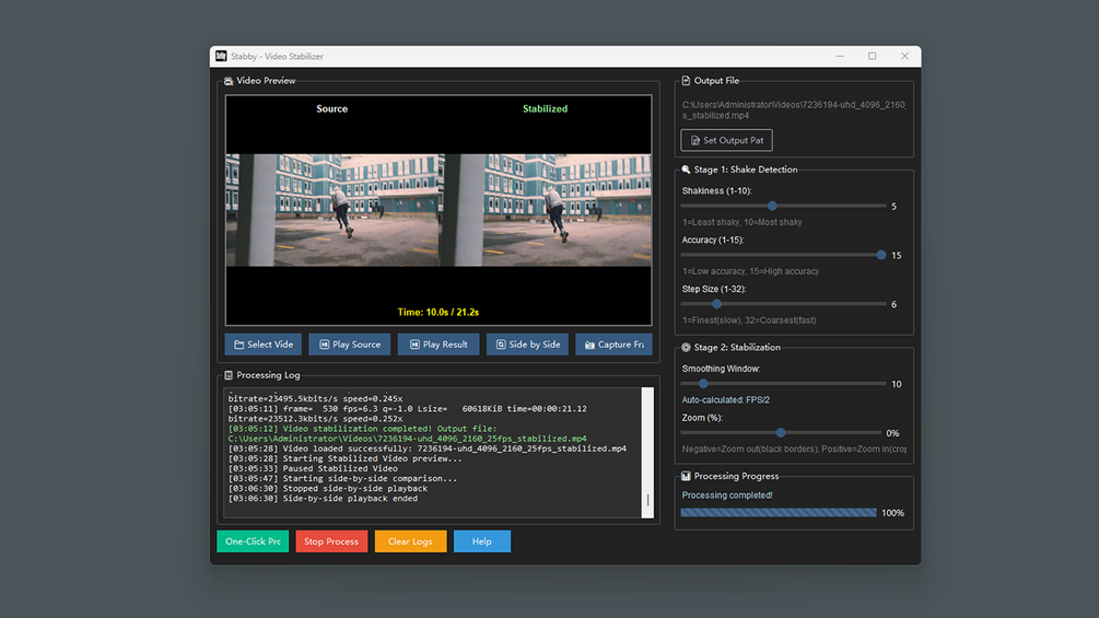 β€’ Side by Side: Play source and stabilized videos simultaneously for comparison